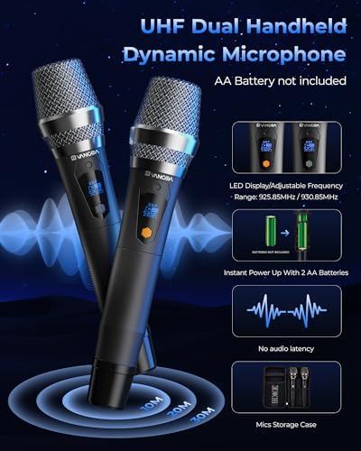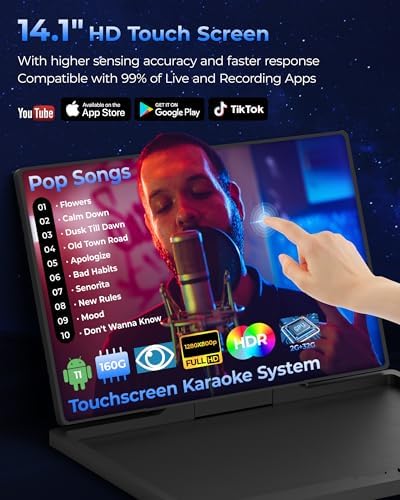 ✅ Professional Karaoke Machine with 14.1″ lyrics display touch screen incorporates a high-speed CPU, complemented by pre-installed apps and an extensive digital song library. Also, Karaoke Machine with 2 wireless microphones boasts a signal transmission range of up to 130ft, catering perfectly to large gatherings