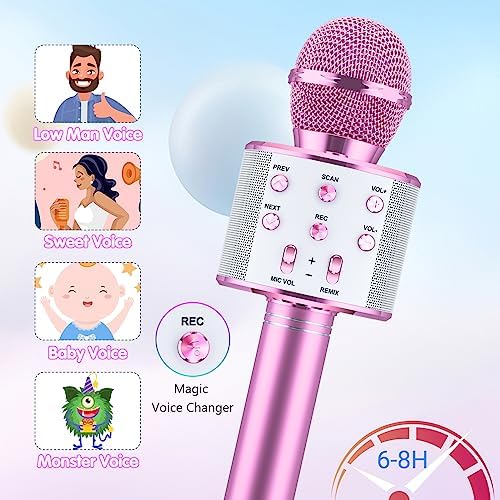 【Multi-Function Microphone】The 5-in-1 toy microphone for kids can be used as karaoke mic, Bluetooth speaker, FM radio,voice changer and recorder. Portable and awesome for singing at anywhere.